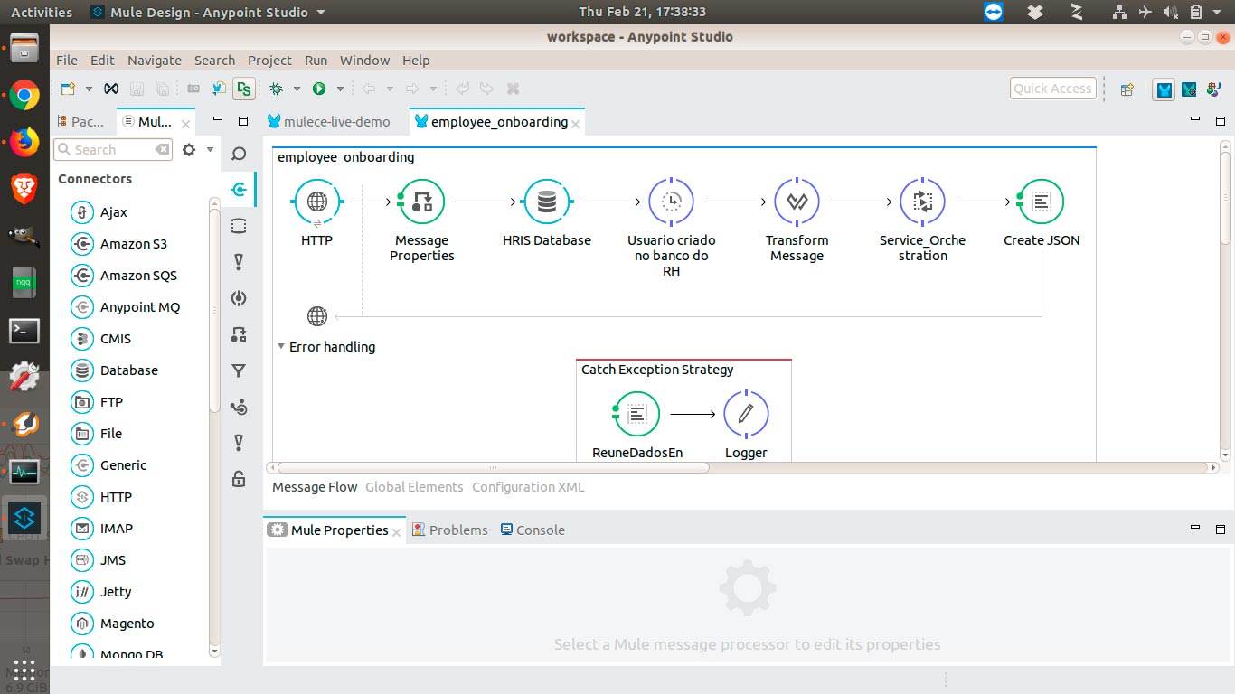 Além disso, é possível conectar sistemas, integrar aplicativos e implementar APIs graficamente ou com código dentro do Anypoint Studio de forma robusta, em um ambiente de desenvolvimento local, que é integrado e unificado para o Anypoint Platform.