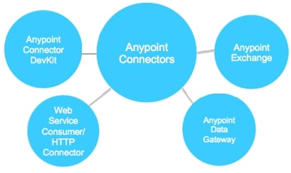 Os conectores Anypoint facilitam a integração com APIs próprias ou de terceiros, além de trabalhar com todos os protocolos de integração padrão, fornecendo meios para acessar serviços e recursos da web. Outra função é conseguir usar os conectores prontos nos fluxos do Mule para enviar e receber dados através de um protocolo ou usando uma API.