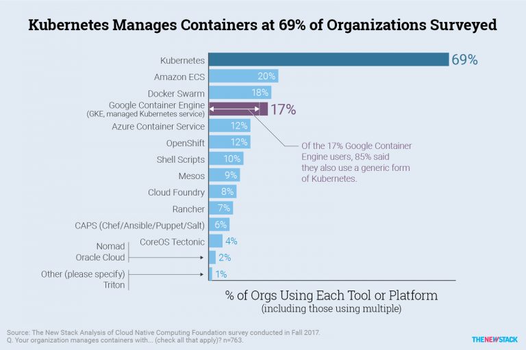 No fim de 2017, uma pesquisa da Cloud Native Computing Foundation, buscou saber quais ferramentas de orquestração de containers eram mais utilizadas pelas empresas. Embora o Kubernetes lidere o ranking de utilização, a pesquisa revelou que as empresas costumam fazer uso de mais de uma solução, conforme evidenciado pelo gráfico abaixo: