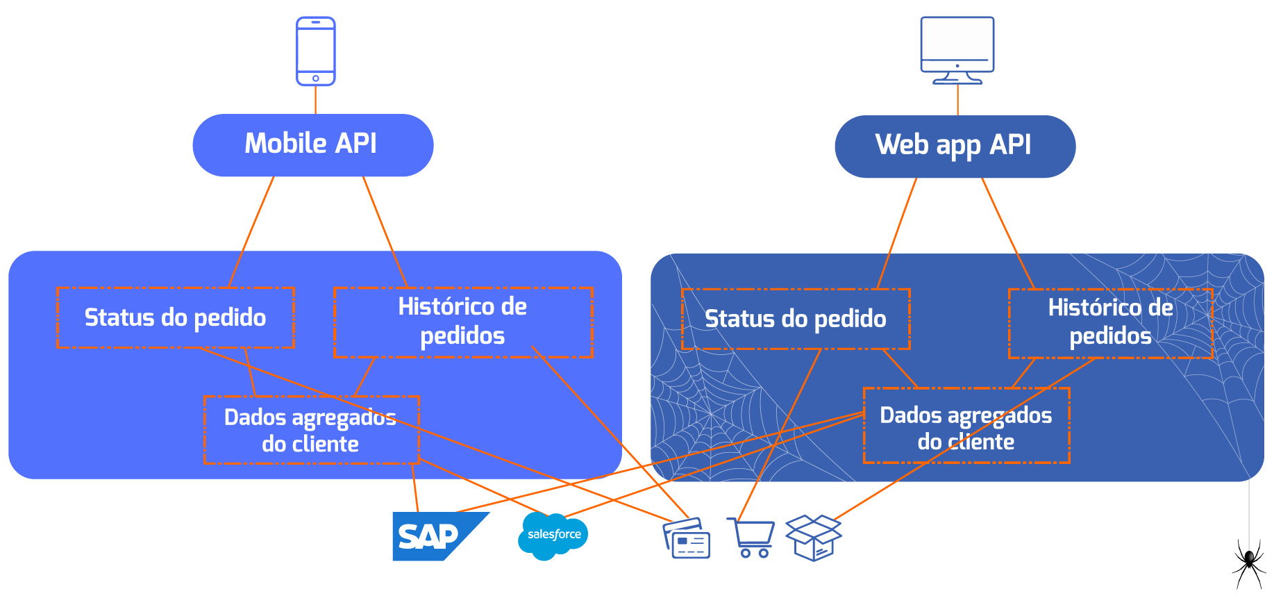 Por exemplo, as informações do cliente podem ser expostas através de 2 ou 3 APIs do sistema. Desta forma, cria-se uma visão do cliente, compondo os campos dessas três APIs.
