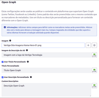 Na configuração da página é possível definir atributos específicos em um formulário amigável, e uma vez preenchidos, todas as tags necessárias de acordo com a especificação Open Graph serão adicionadas na página de forma transparente para o gestor.