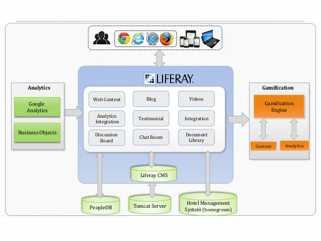 Um exemplo de plataforma de portal é o Liferay, solução open source hoje líder de mercado pelo sexto ano seguido, que reúne um conjunto de ferramentas para desenvolver, produzir, publicar e gerenciar de forma bastante eficaz tanto os conteúdos como a interface gráfica de portais. Um dos aspectos importantes do Liferay é a estabilidade da plataforma e a segurança para transmitir e armazenar informação, empresas como Azul, Avianca, Smiles, Cisco, Mapfre estão usando a solução de Portal Liferay.